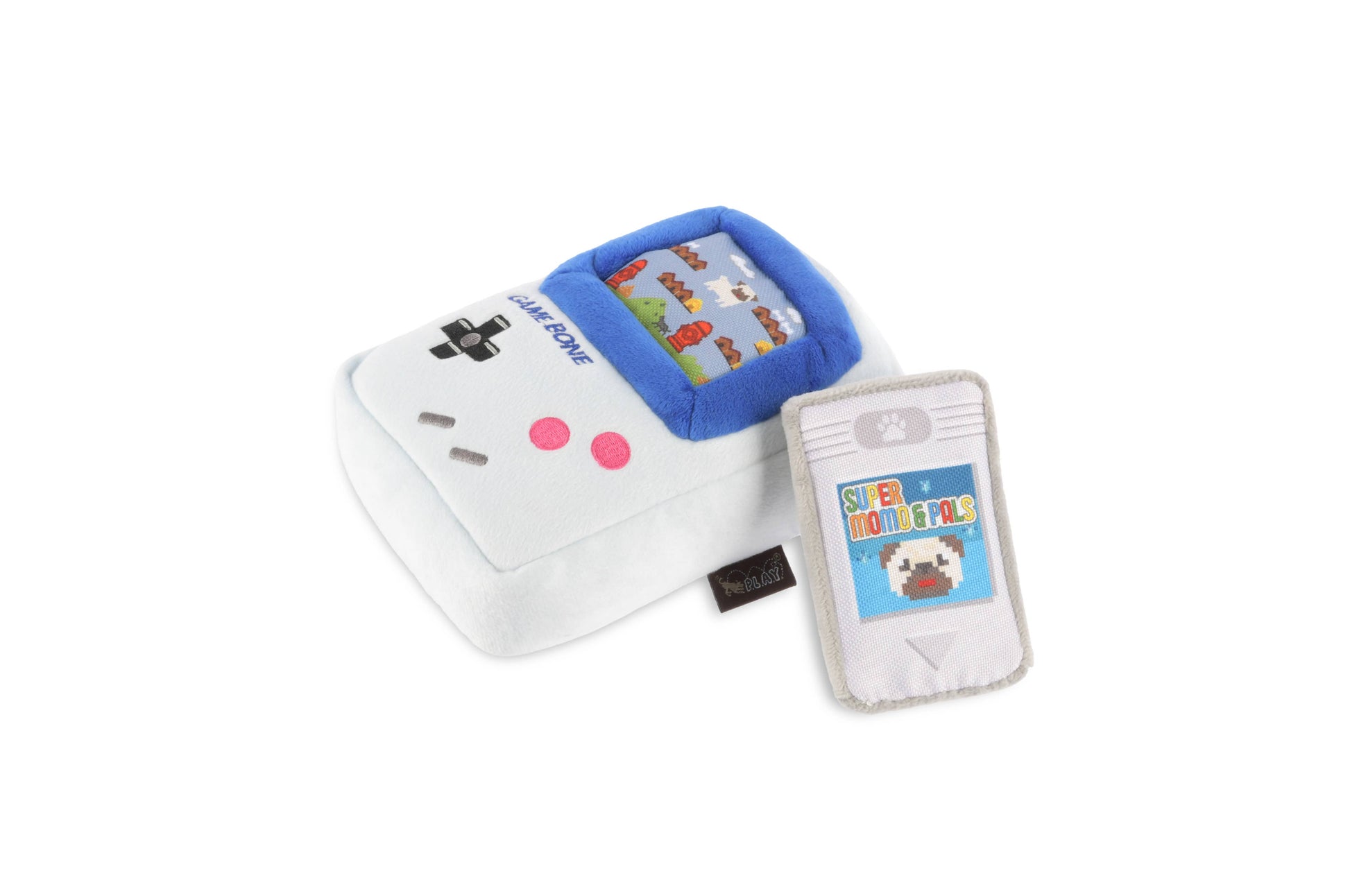 Level up playtime for your furry gamer with P.L.A.Y.’s 90s Classics Game Bone toy! This Gameboy-inspired toy boasts a detachable video game named “Super Momo & Pals” with a box squeaker inside for double the fun. The game bone itself features a squeaker in the body for thrilling play and crinkle fabric on the sides for an extra touch of texture. Watch your pup embark on a canine quest with Momo and her pals in every play session! Hand-made craftsmanship, double layer exterior and reinforced stitching for extra durability Eco-friendly PlanetFill® filler is made from 100% post-consumer certified-safe recycled plastic bottles Machine washable and dryer friendly Features AZO-free dyes All of our toys meet the same strict quality standards for manufacturing infant and children products. Meet requirements for EN71 – Part 1, 2, 3 & 9 (EU), ASTM F963 (US) toy safety standards and REACH - SVHC