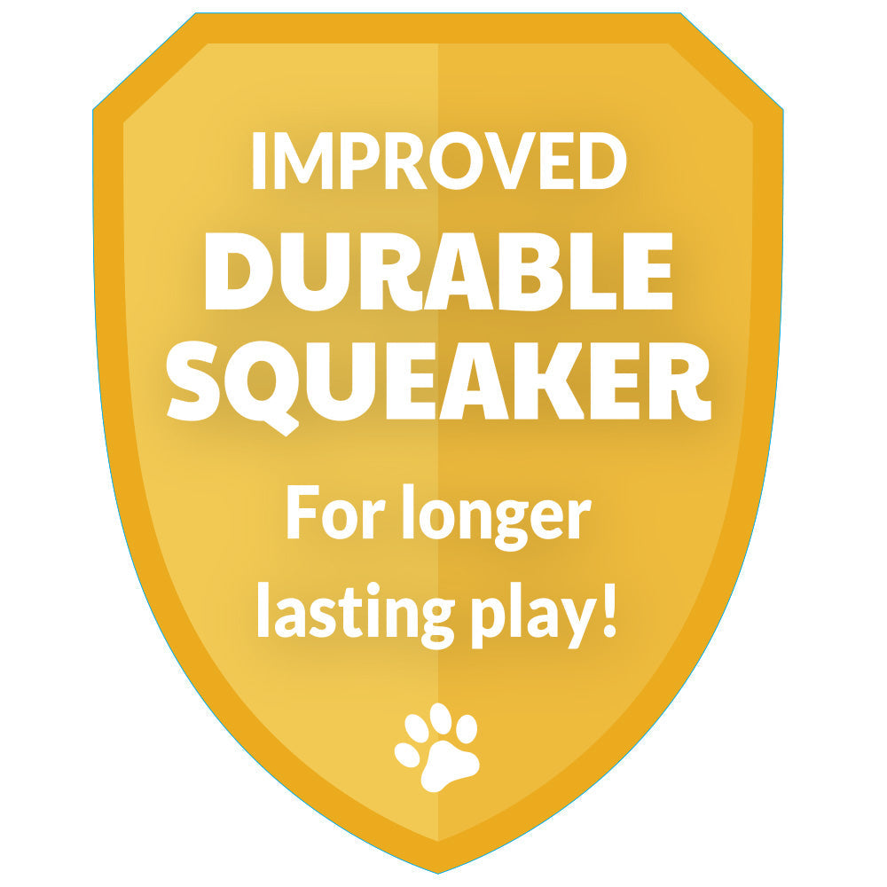Our Large and Jumbo sizes have been pup-graded for 2023 with an improved durable noisemaker! Our new formulated squeaker has a thicker wall and harder density to better withstand the power of dogs' jaws and sharp K9s. This new and improved squeaker is just hard enough to provide a more challenging ‘squeak’ for dogs and ‘squeeze’ for humans that occupies attention while still keeping pups engaged, extending playtime a little longer.