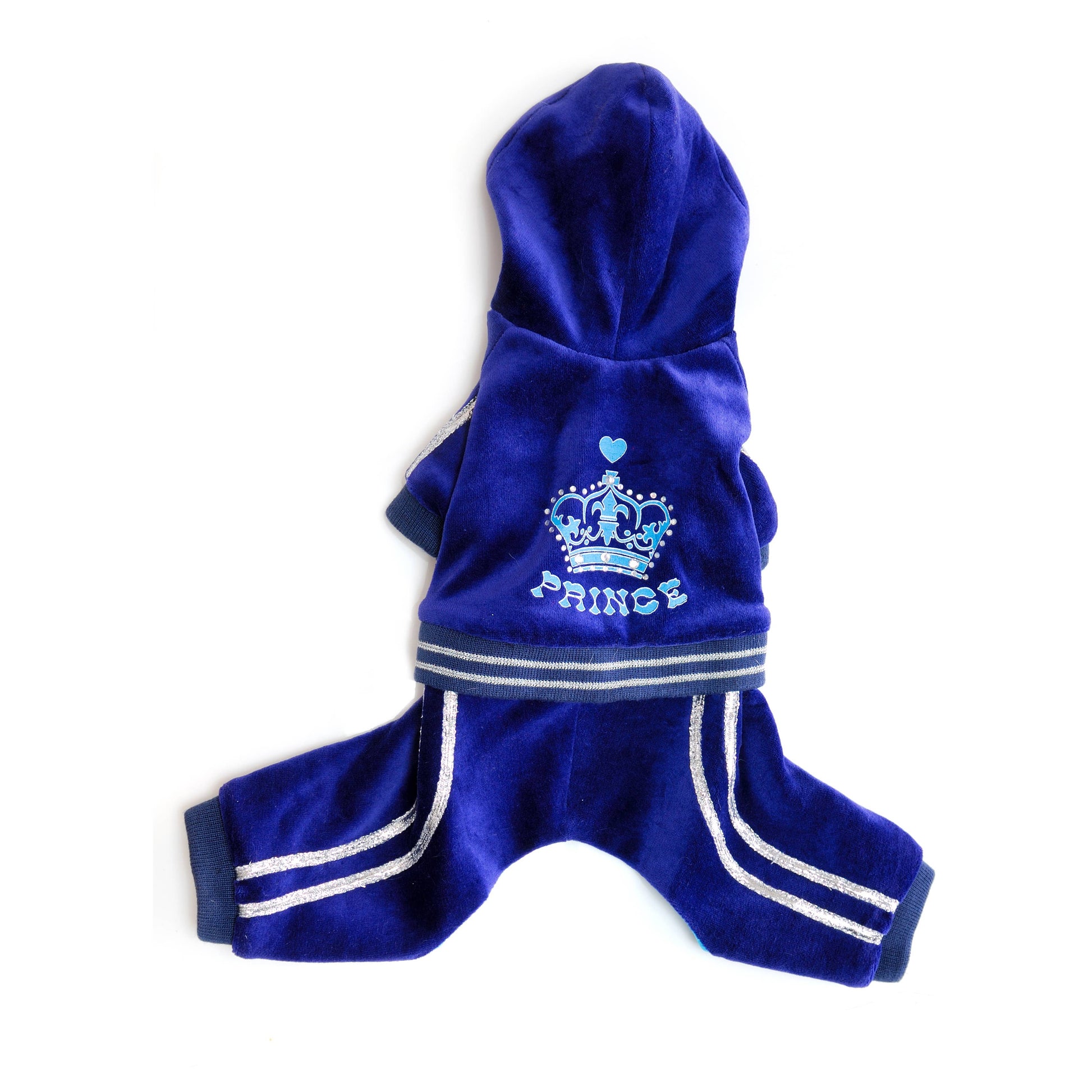 Royal velour tracksuit with crown embroideries, rhinestones, silver piping, and full lining. Velcro closures. 80% cotton, 20% polyester. Royal blue.