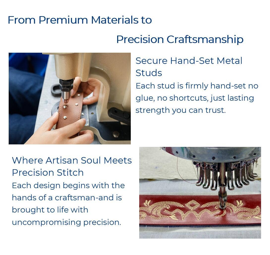 Handcrafted from premium full-grain genuine leather (the highest quality leather that retains the natural strength and character of the hide for superior durability and a timeless look), this wide statement collar showcases classic patterned embroidery with flowing leaf motifs and other intricate designs, finished with decorative accents — available with turquoise stones on the tan collar, and pearls on the red and white collars. all three colors have beautiful metal studs. Inspired by Western and bohemian aesthetics, it’s both stylish and durable. These are perfect for rodeos! Check out our matching leash.